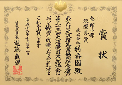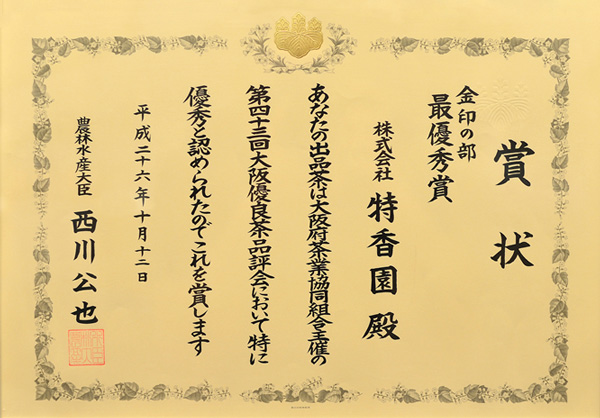 第26回大阪優良茶品評会 金印の部 優秀賞 全国茶商工業協同組合連合会理事長賞 受賞