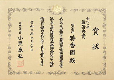 第24回大阪優良茶品評会 金印の部 優秀賞 大阪府茶業組合理事長賞 受賞