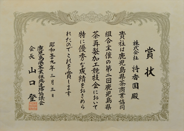 鹿児島県茶市場設立40周年記念大会 鹿児島県茶業会議所会頭賞 受賞