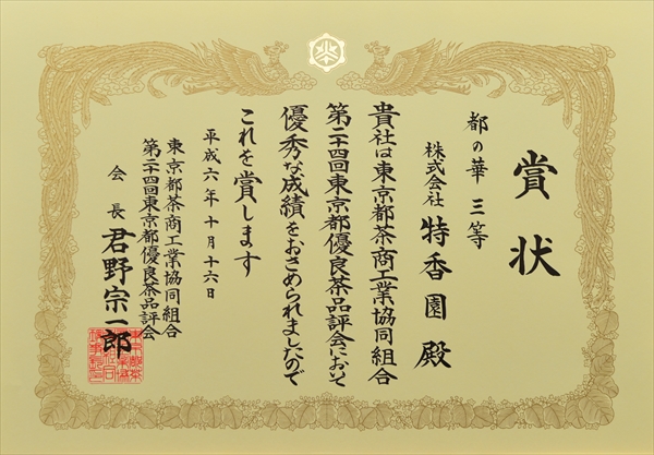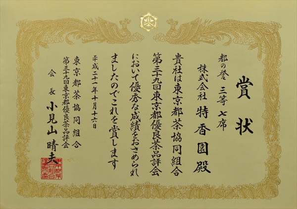 第38回東京優良茶品評会 都の華1等3席 東京都茶協同組合理事長賞 受賞