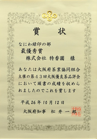 第41回大阪優良茶品評会 なにわみどり印の部 優秀賞 日本茶業中央会会長賞 受賞